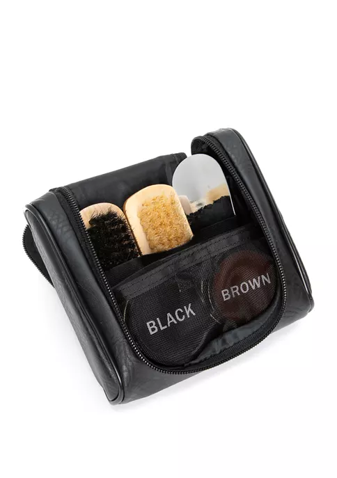 Packaged in a convenient travel case, this shoe shine kit from Perry Ellis® features 2 brushes, 2 polishes, 1 shine cloth, and 1 shoehorn.