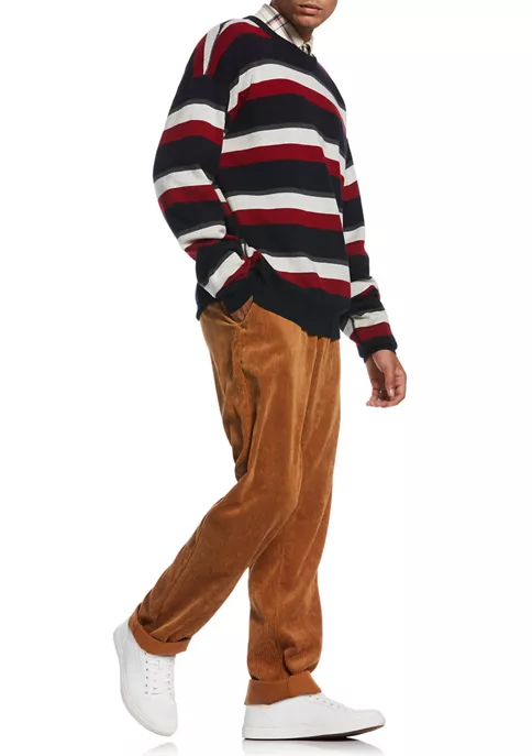 Jacquard fabrication creates a textured feel on this striped sweater from Perry Ellis® complete with ribbing along the collar, hem, and cuffs.